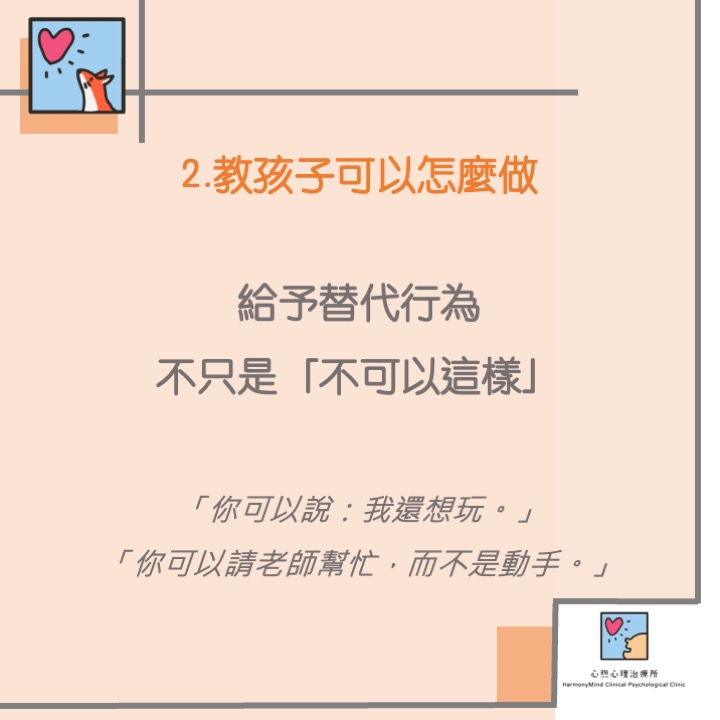 2.教孩子「可以怎麼做」:學齡前孩子需要具體替代行為,例如:「你可以說:我還想玩。」「你可以請老師幫忙,而不是動手。」