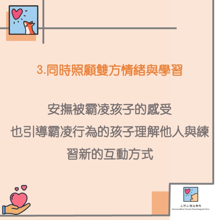 3.同時照顧雙方的情緒與學習:安撫被霸凌孩子的感受,也引導霸凌行為的孩子理解他人與練習新的互動方式。