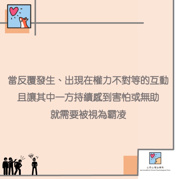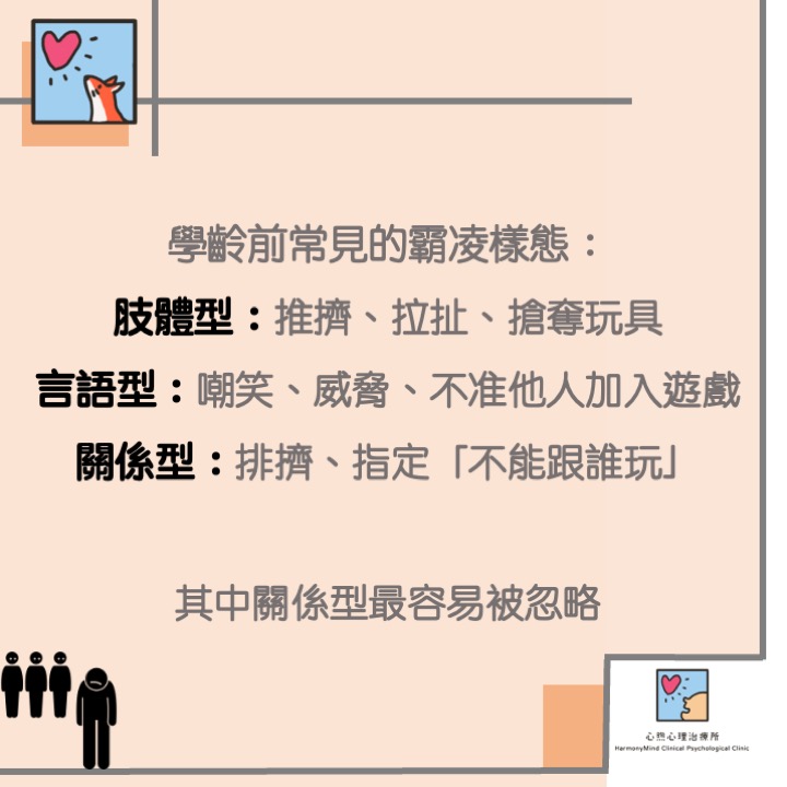 學齡前兒童(約3–6歲)仍在學習情緒調節、衝動控制與同理他人。他們可能會透過推人、搶玩具、排擠同伴等方式,來滿足「想要」、「不想等待」或「想掌控遊戲」的需求。當這類行為 反覆發生、出現在權力不對等的互動中,並讓其中一方持續感到害怕或無助,就需要被視為霸凌,而非單純的衝突。