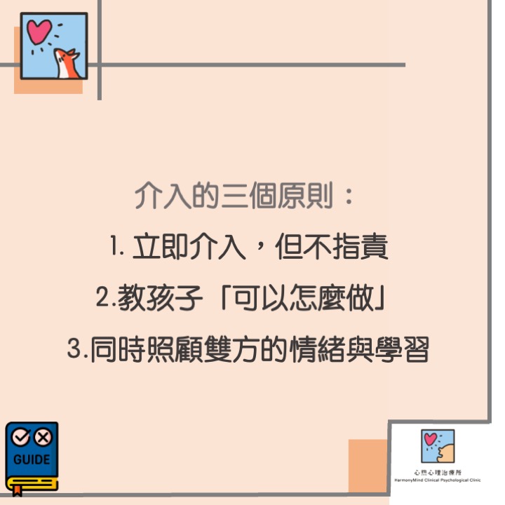 大人介入時,最重要的三個原則:1. 立即介入,但不指責。2.教孩子「可以怎麼做」,而不只「不可以做」。3.同時照顧雙方的情緒與學習。