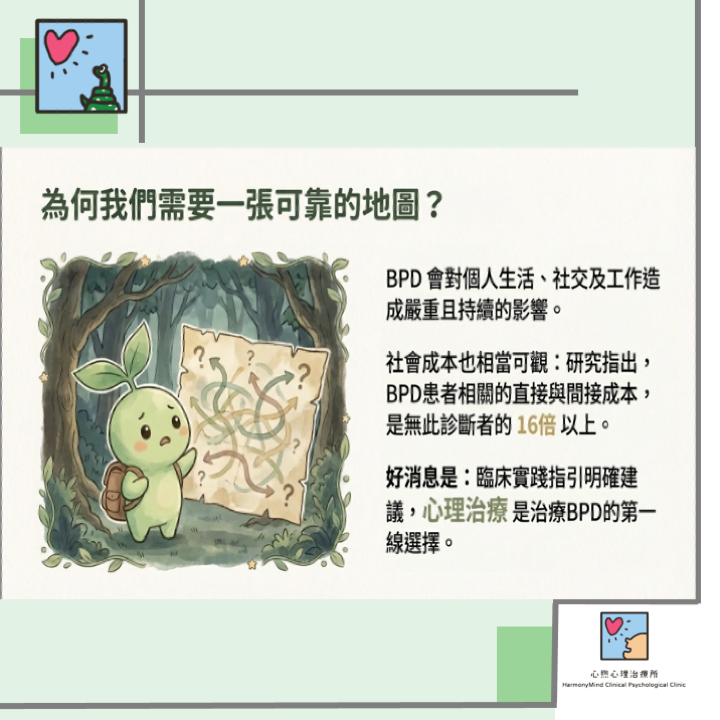 • 生活的巨大風暴: 對於患者而言,BPD 就像一場席捲生活的風暴。他們長期承受著功能損害,包含情緒的劇烈波動、難以控制的衝動、自我傷害行為,以及反覆出現的自殺念頭。這些痛苦不僅造成個人生活與職業功能的困難,也帶來了極高的社會成本,其年度花費是一名健康者的16 倍以上。