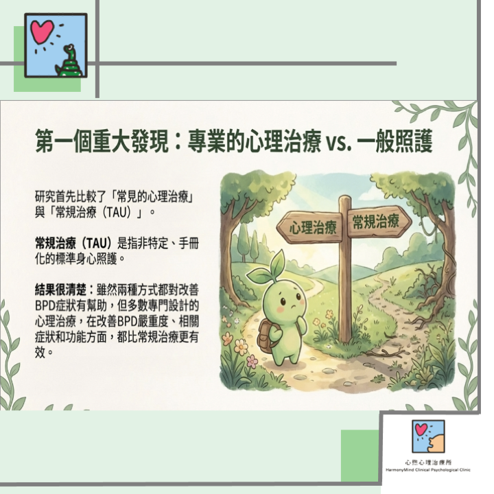 偵探們發現的第一個線索,是個非常振奮人心的結論:無論是接受特定的心理治療,還是僅接受常規治療,患者在BPD嚴重程度、相關症狀及日常功能上,都顯示出改善的趨勢。