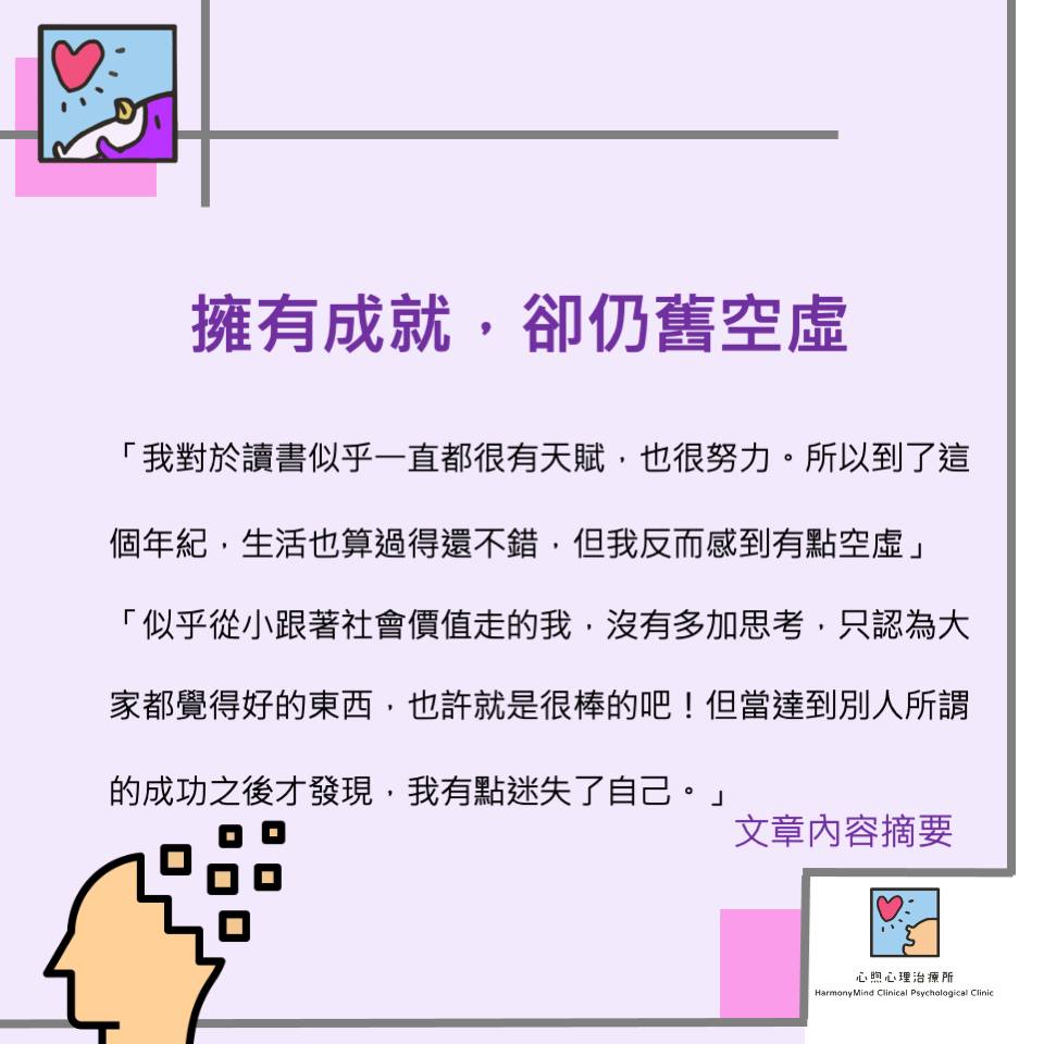 小偉是一個事業有成的工程師,從小成績都是名列前茅,也如願考上了第一志願,生活似乎非常順風順水。「我對於讀書似乎一直都很有天賦,也很努力。所以到了這個年紀,生活也過得還不錯,但我反而感到有點空虛」。我好奇小偉似乎擁有著很多其他人稱羨的東西,但仍然覺得空虛的理由。小偉表示:「似乎從小跟著社會價值走的我,沒有多加思考,只認為大家都覺得好的東西,也許就是很棒的吧!但當達到別人所謂的成功之後才發現,我有點迷失了自己。」-