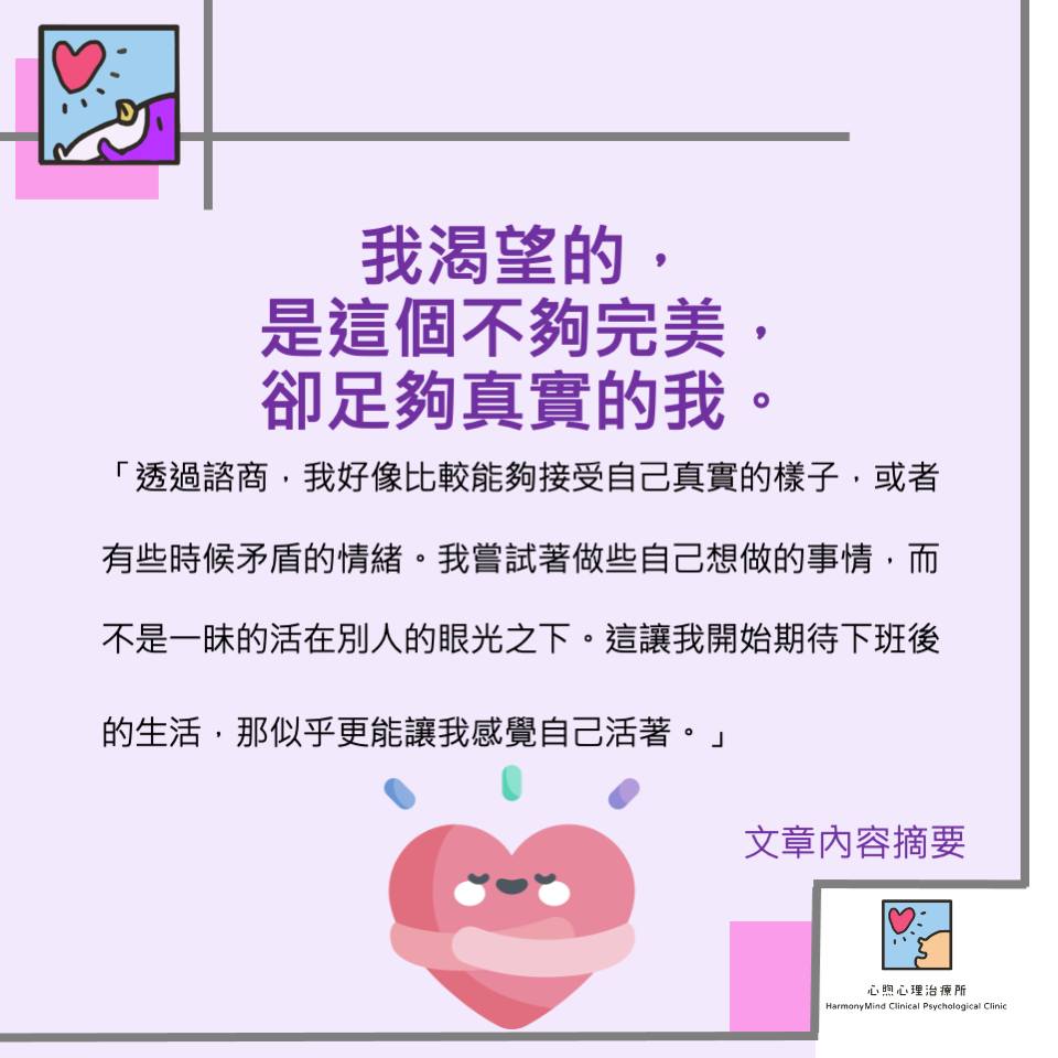漸漸的,小偉在諮商中直接面對了他最害怕的感覺,並且逐漸開始享受生活。他了解到,只有當自己開始接納自己並好好與之相處時,看待外界的眼光才會跟著改變。「我好像比較能夠接受自己真實的樣子,或者有些時候矛盾的情緒。我嘗試著做些自己想做的事情,而不是一昧的活在別人的眼光之下。這讓我開始期待下班後的生活,那似乎更能讓我感覺自己活著。」最終,小偉帶著感謝與滿足離開了治療室,「我渴望的,也許一直都是這個不夠完美,卻足夠真實的我自己。」-