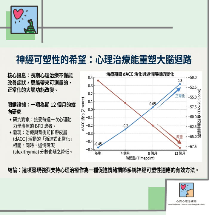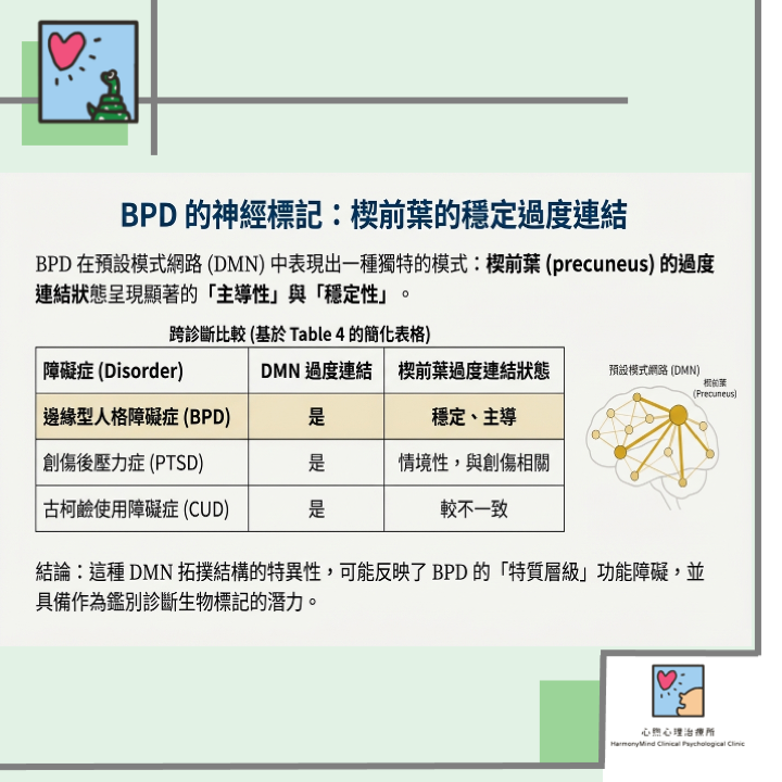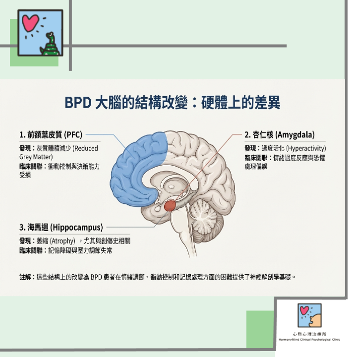 這些大腦結構上的差異,有力地證明了BPD的生理基礎,幫助我們將對話的焦點從對個人的指責,轉向對其生物學脆弱性的理解與支持。