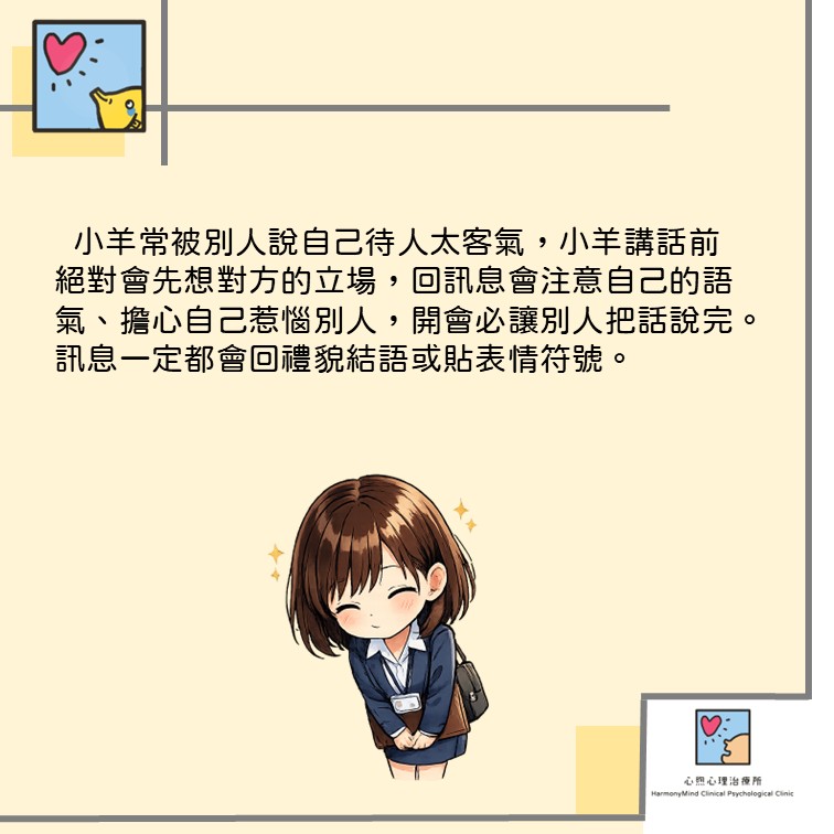 小羊常被別人說自己待人太客氣:小羊講話前絕對會先想對方的立場,回訊息會注意自己的語氣、擔心自己惹惱別人,開會必讓別人把話說完。訊息一定都會回禮貌結語或貼表情符號。
