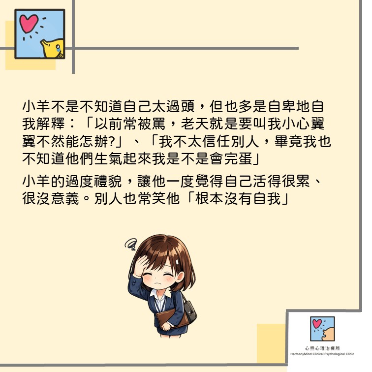 小羊不是不知道自己太過頭,但也多是自卑地自我解釋:「以前常被罵,老天就是要叫我小心翼翼不然能怎辦?」、「我不太信任別人,畢竟我也不知道他們生氣起來我是不是會完蛋」這種過度禮貌,讓小羊一度覺得自己活得很累、很沒意義。別人也常笑他「根本沒有自我」