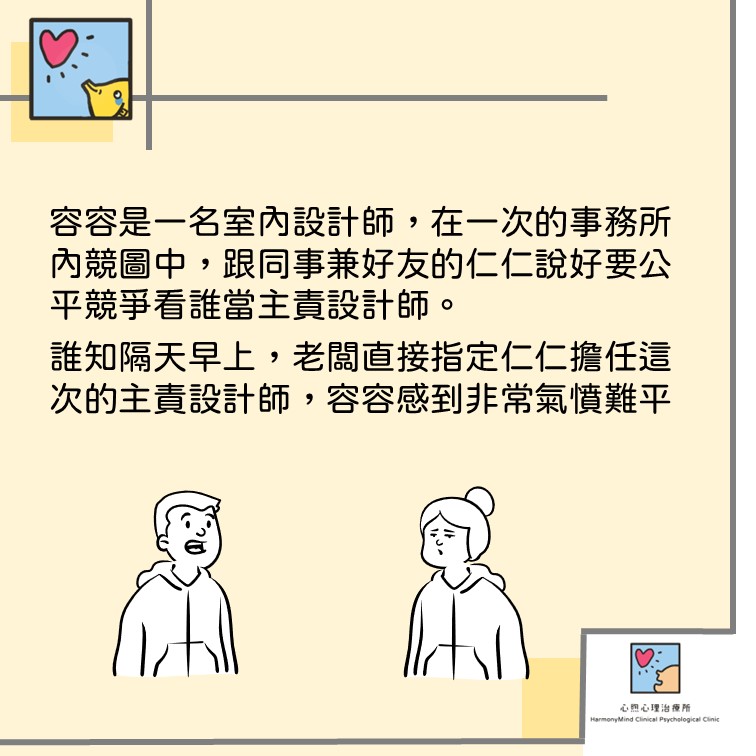 容容是一名室內設計師,在一次的事務所內競圖中,跟同事兼好友的仁仁說好要公平競爭看誰當主責設計師。誰知隔天早上,老闆直接指定仁仁擔任這次的主責設計師,容容感到非常氣憤難平,在向老闆表達不滿後,老闆跟容容說是因為這次的客戶在電話中有說特別喜歡仁仁某一個作品,所以老闆才直接指定仁仁的。