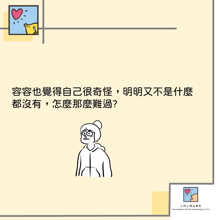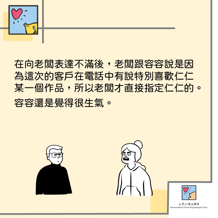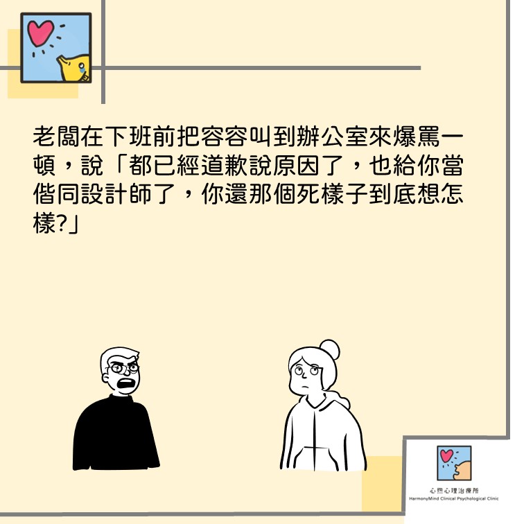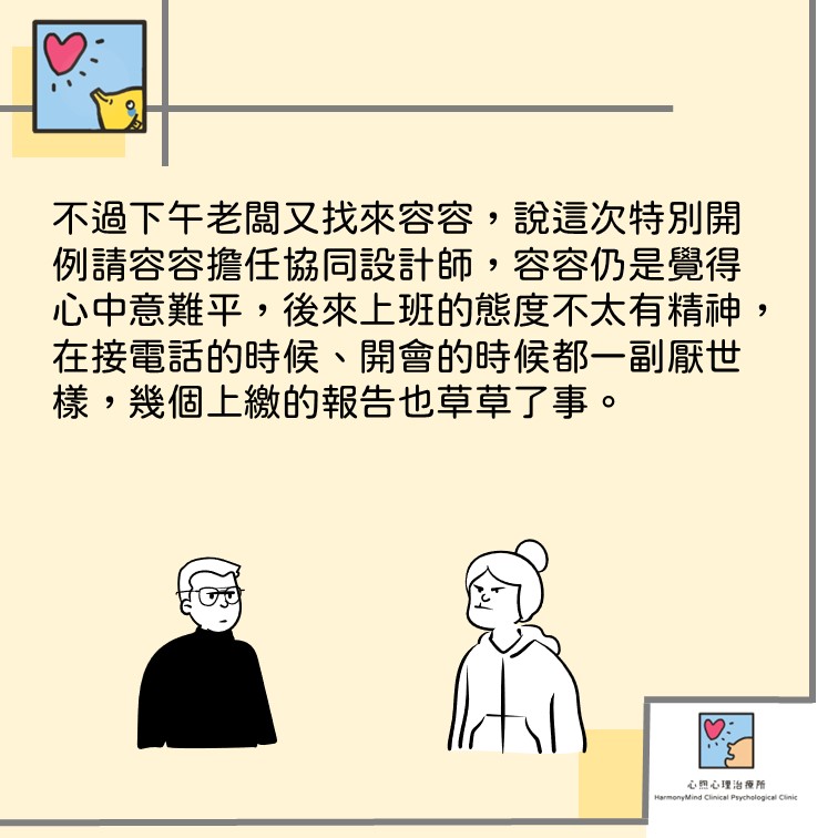 下午老闆又找來容容,說這次特別開例請容容擔任協同設計師,容容仍是覺得心理悵然若失,後來上班的態度不太有精神,在接電話的時候、開會的時候都一副厭世樣,幾個上繳的報告也草草了事,老闆在下班前把容容叫到辦公室來爆罵一頓,說「都已經道歉說原因了,也給你好任務了,你還那個死樣子到底想怎樣?」容容也覺得自己很奇怪,明明又不是什麼都沒有,怎麼那麼難過?。