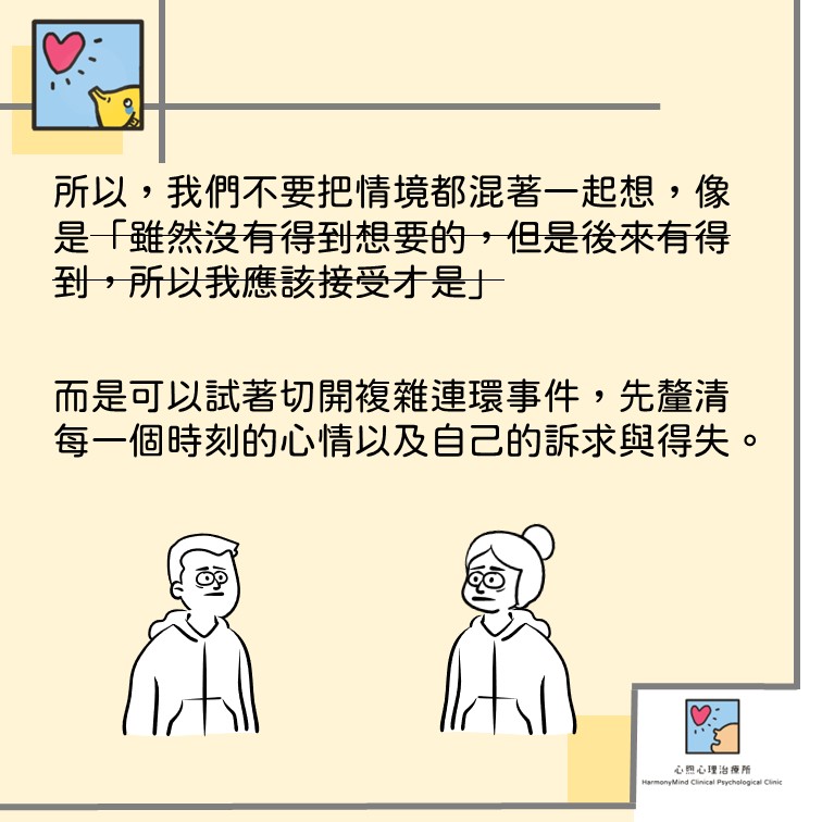 所以我們需要「#好好的感受單一個情境」阿! 我們不要都混著一起想「雖然沒有得到想要的但是後來有得到,所以我應該接受才是」,而是可以試著切開複雜連環事件,先釐清每一個時刻的心情以及自己的#訴求 與 #得失,如容容先回到起初那個老闆直接指定仁仁的情境,找回憤怒的自己「我覺得不公平,沒有依照一開始說的公平競爭,所以我心中已經有了失落與不滿」    這樣一來,容容再度獲得偕同治療師這個也還不錯的任務時,容容已經可以保留感覺「單看新任務是好的而開心」,但也能產生哀傷的感受「雖然有比沒有好,但那不是原本我想要的,我也不必那麼欣然接受」,對於老闆的憤怒指責,容容不再認同,只覺得老闆「因為自己的斷然決定而在逼下面的人接受」,並不覺得是自己不識好歹了。