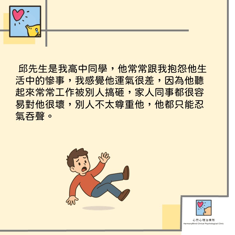 邱先生是我高中同學,他常常跟我抱怨他生活中的慘事,我感覺他運氣很差,因為他聽起來常常工作被別人搞砸,家人同事都很容易對他很壞,別人不太尊重他,他都只能忍氣吞聲。