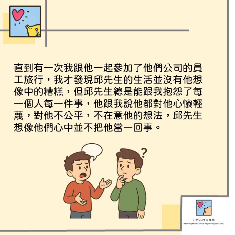 但直到有一次我跟他一起參加了他們公司的員工旅行,我才發現邱先生的生活並沒有他想像中的糟糕,但邱先生總是能跟我抱怨了每一個人每一件事,他跟我說他都對他心懷輕蔑,對他不公平,不在意他的想法,邱先生想像他們心中並不把他當一回事。