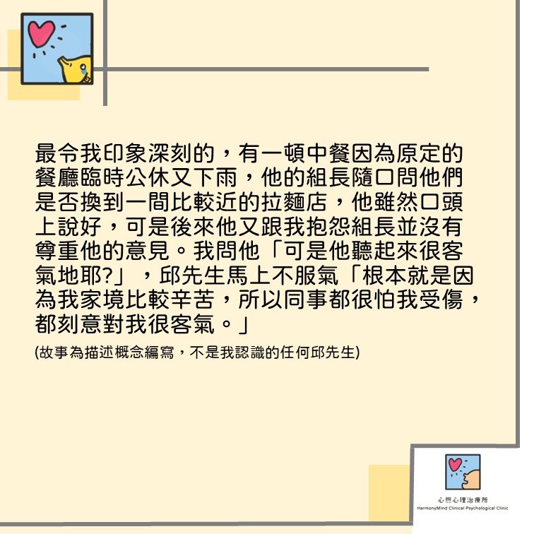 最令我印象深刻的,有一頓中餐因為原定的餐廳臨時公休又下雨,他的組長隨口問他們是否換到一間比較近的拉麵店,他雖然口頭上說好,後來也吃得蠻開心的(看起來是表面上),因為後來他又跟我抱怨組長沒有尊重他的意見,他沒有什麼選擇權,我跟說「可是他聽起來很客氣?」,邱先生馬上回我「根本就是因為我家境比較辛苦,所以同事都很怕我受傷,都刻意對我很客氣。」…。