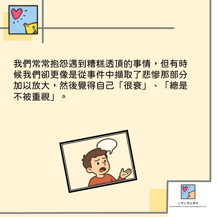 我們常常抱怨遇到糟糕透頂的事情,但有時候,我們卻更像是從事件中擷取了悲慘那部分加以放大,然後覺得自己「很衰」、「總是不被重視」。