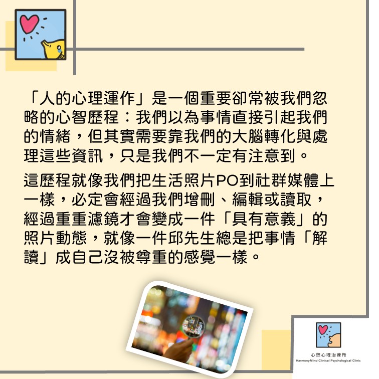 不是說世上無壞事(畢竟真的有各種不如自己預期的壞事),我想強調的是「人的心理運作」在面對事件時的重要腳色:其實一件事件發生都包含了「在腦中產生意義」的過程, #就像把景物照片PO到社群媒體上一樣 ,#必定會經過我們內心增刪 、 #編輯或讀取 (有時候是有意識地有時候無意識的),經過重重濾鏡才會變成一件「具有意義」的照片動態,就像一件邱先生總是把事情「解讀」成自己沒被尊重的感覺一樣。 更有意思的是,人的心理運作不僅處理了我們對於事件及資訊接收及解釋, #也會持續造就我們在各個事件中變成相同腳色 , #讓心中的劇本在不同場景持續上演 。