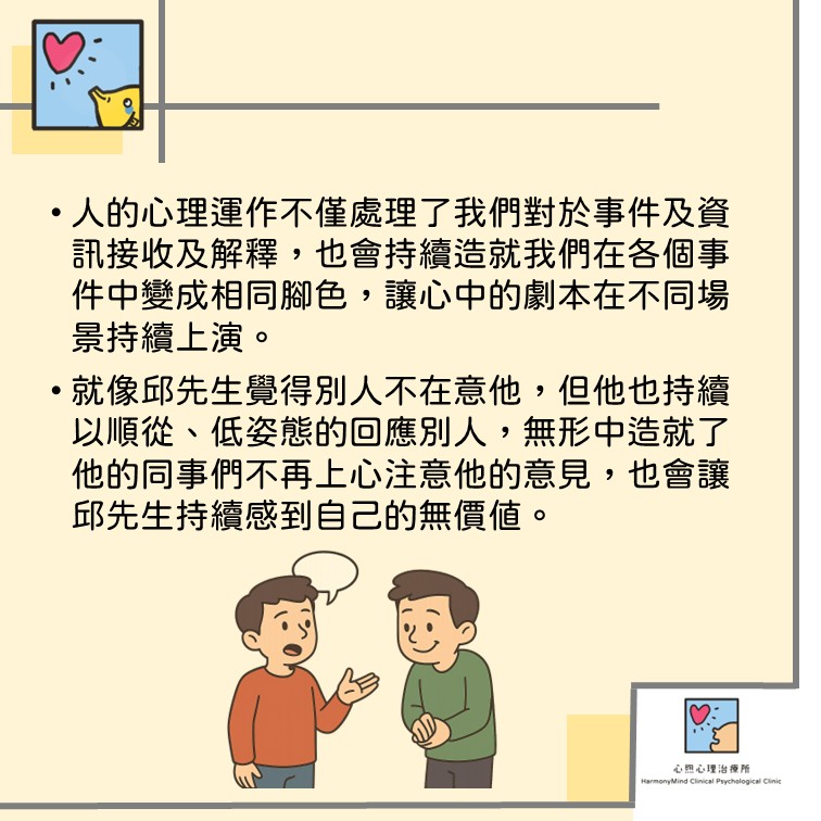 就像邱先生覺得別人不在意他,但他也持續以順從、低姿態的回應別人,無形中造就了他的同事們不再上心注意他的意見,也會讓邱先生持續感到自己的無價值。