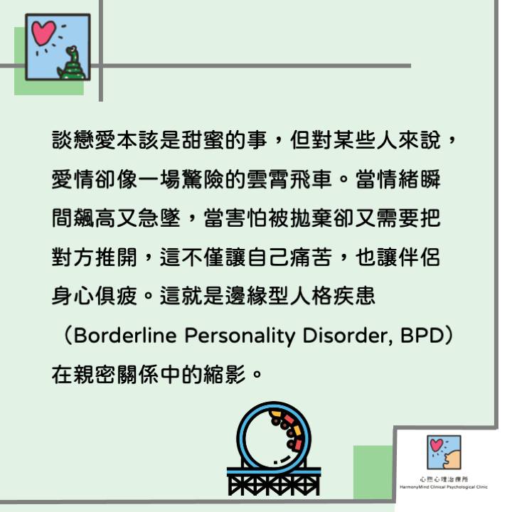 在日常生活中你或許遇過這樣的人,情緒像雲霄飛車般起伏不定,上一秒還在開心地聊天,下一秒卻因一句無心的話瞬間變得冷淡甚至暴怒。他們在人際關係裡格外敏感,害怕被拋棄,卻又時常因衝動的反應把別人推開。這種狀態,正是邊緣型人格疾患(Borderline Personality Disorder, BPD)的特徵之一。