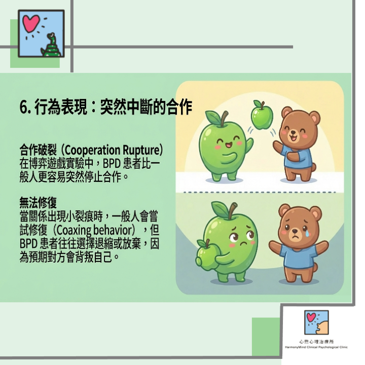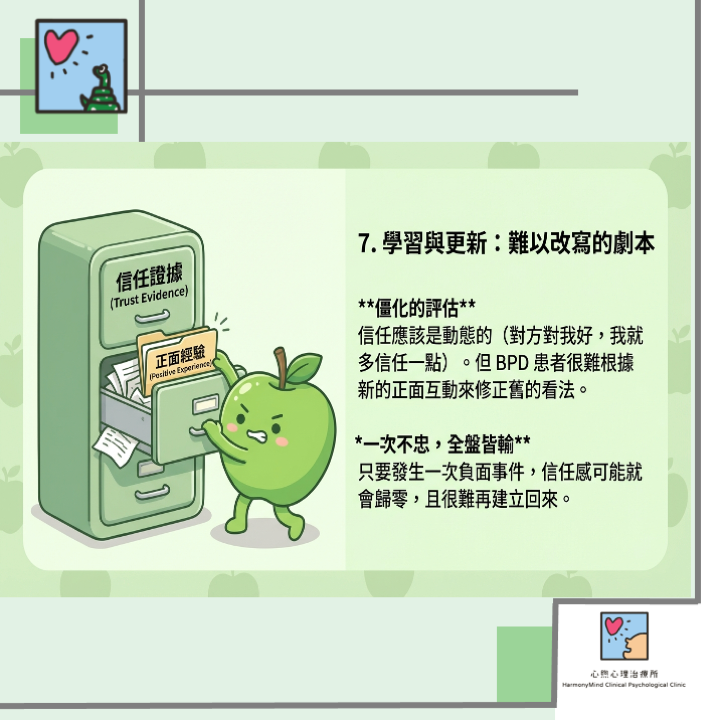在判斷他人是否可信時,研究也發現一個穩定的現象:BPD 者更容易先假設對方不可靠。即使線索不多,或對方並沒有明顯惡意,他們仍傾向認為「出事的機率比較高」。有趣的是,這不完全是情緒失控的問題,而可能和「評估風險」的方式有關,使他們在不確定的關係中,很難安心等待事情慢慢發展。這樣的判斷,自然會影響行為。有些人會選擇提早抽身、少付出一點,避免之後更痛;有些人則會在關係裡反覆拉近又推開,測試對方會不會離開。對旁人來說,這些反應可能顯得矛盾甚至破壞關係,但對當事人而言,這往往是保護自己不再受傷的方法。更困難的是,這些互動結果會影響他們之後「怎麼學習信任」。研究發現,BPD 者對負面經驗特別敏感,一次受傷就可能大幅拉低信任感;但即使多次正向互動,卻不容易真正累積成安全感。有時甚至會出現看似矛盾的行為,例如在被傷害後反而更加投入,因為內心極度害怕被徹底拋下。