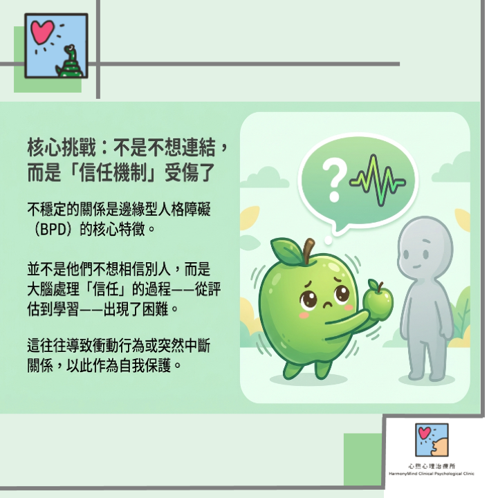 很多人以為,邊緣型人格障礙(BPD)最大的問題在於情緒不穩或人際衝突,但心理研究近年發現,真正貫穿這些困難的關鍵,其實是「信任」。對多數人來說,信任會隨著相處慢慢增加或減少;但對有 BPD 特質的人而言,信任往往從一開始就充滿風險,甚至比陌生還要危險。