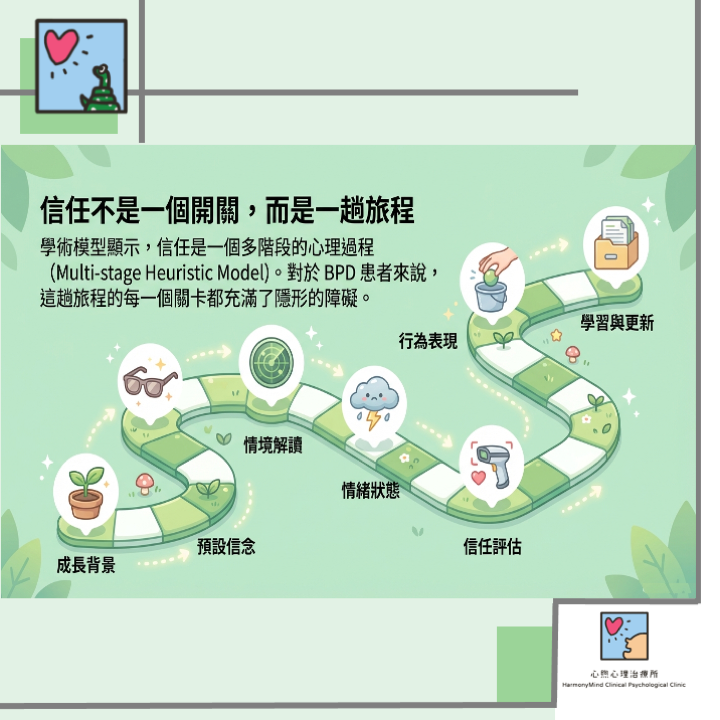 從研究角度來看,這些現象並不是單一問題,而是一整個循環:早期經驗讓人對關係保持警戒,情緒一被觸動就降低信任,行為因此變得防衛或混亂,而這些結果又再次強化「果然不能相信別人」的信念。理解這一點非常重要。BPD 的信任困難,不是愛懷疑、不是故意折磨人,而是一套曾經幫助他們撐過不安全環境的心理系統。研究也提醒我們,真正的改變不是要求他們「快點相信」,而是透過穩定、一致、可修復的關係經驗,讓這個系統慢慢學到:有些關係,是可以不用一直提心吊膽的。