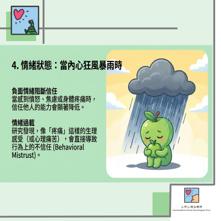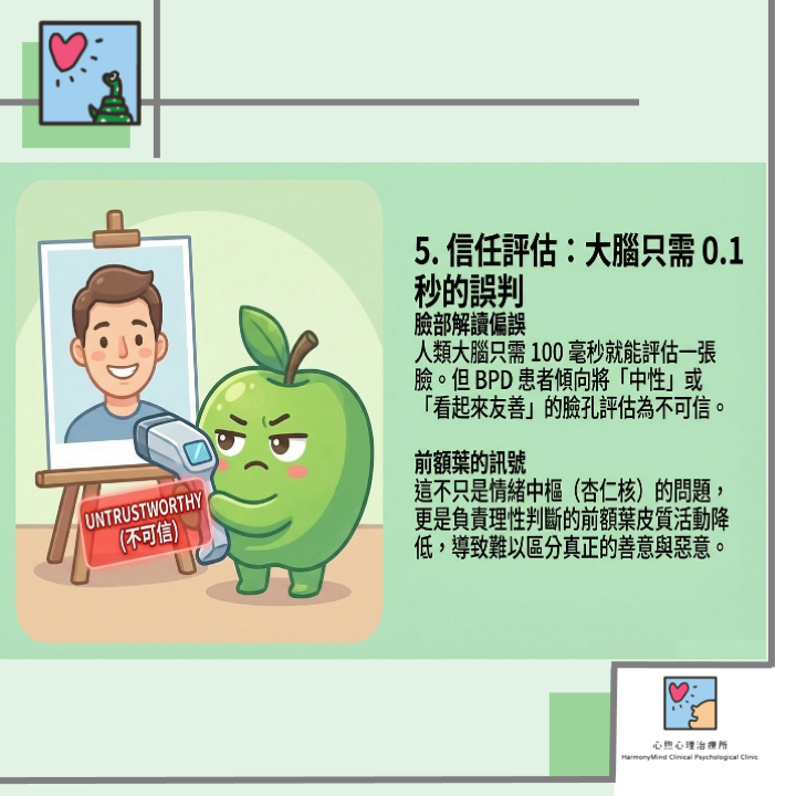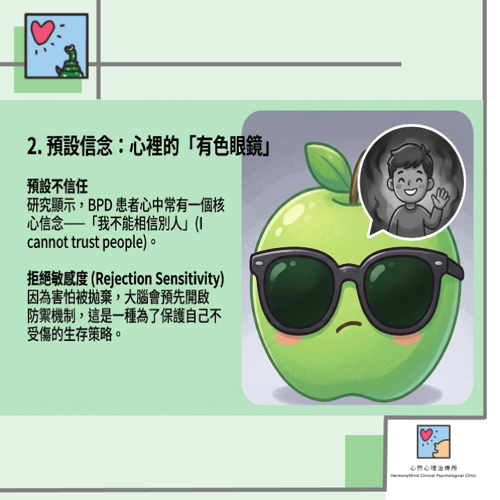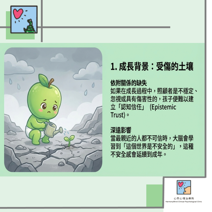 研究指出,這樣的狀態並不是天生的,而是和成長經驗密切相關。許多 BPD 者在童年時期,經驗過照顧不穩定、忽冷忽熱,甚至情感上的忽視或傷害。在這樣的環境中,孩子學到的不是「有人會接住我」,而是「關係隨時可能消失」。這些經驗會在心裡留下深刻的印象,影響一個人長大後如何看待他人與關係。長大之後,這些早期經驗並不會自動消失,而是默默影響著每一次人際互動。研究發現,當 BPD 者感到不安、被忽略或情緒本來就很低落時,對他人的信任感會迅速下降。這不一定是因為對方真的做錯了什麼,而是內心的警報系統已經被觸發,提醒自己「小心一點,可能會受傷」。