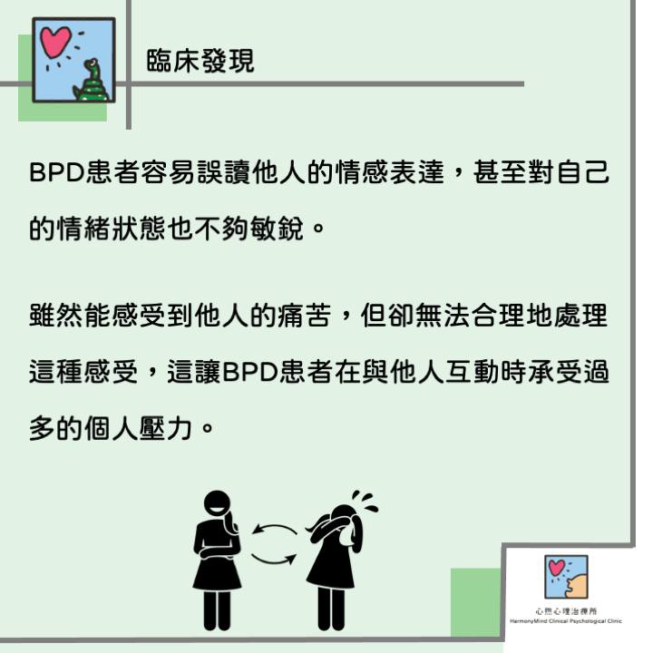 研究發現,BPD患者無論在覺察自我還是他人情緒方面,都較一般人表現差。不僅容易誤讀他人的情感表達,甚至對自己的情緒狀態也不夠敏銳。此外,患者雖然能感受到他人的痛苦,但卻無法合理地處理這種感受,這讓他們在與他人互動時承受過多的個人壓力。