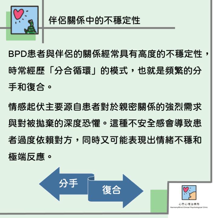 研究顯示,BPD患者與伴侶的關係經常具有高度的不穩定性,時常經歷「分合循環」的模式,也就是頻繁的分手和復合。這種情感起伏主要源自患者對於親密關係的強烈需求與對被拋棄的深度恐懼。這種不安全感會導致患者過度依賴對方,同時又可能表現出情緒不穩和極端反應,使得伴侶感到困惑甚至受到壓力。