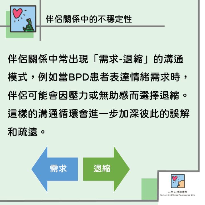 BPD患者在溝通上往往存在困難,特別是表達需求和處理衝突的時候。許多研究指出,這類伴侶關係中常出現「需求-退縮」的溝通模式,例如當BPD患者表達情緒需求時,伴侶可能會因壓力或無助感而選擇退縮。這樣的溝通循環會進一步加深彼此的誤解和疏遠。此外,BPD患者通常存在依附問題,包括害怕被拒絕和親密恐懼,這使得他們在建立和維持親密關係時面臨更大的挑戰。