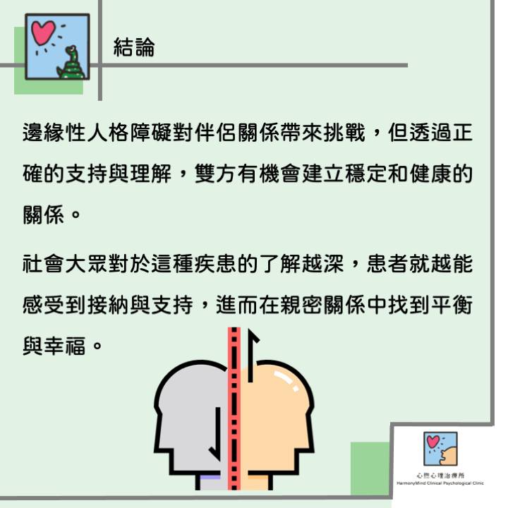 邊緣性人格障礙對伴侶關係帶來挑戰,但透過正確的支持與理解,雙方有機會建立穩定和健康的關係。社會大眾對於這種疾患的了解越深,患者就越能感受到接納與支持,進而在親密關係中找到平衡與幸福。