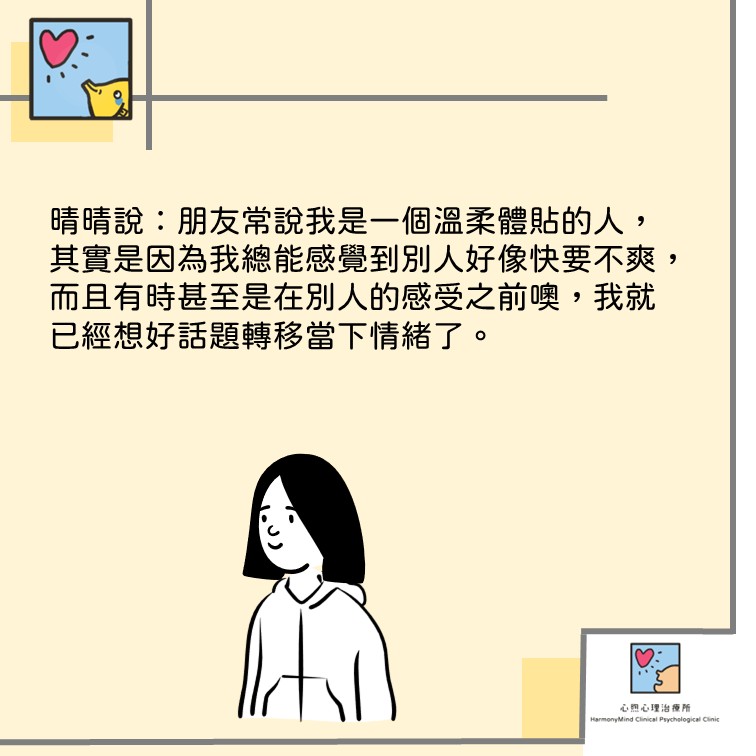 晴晴娓娓地說:朋友常說我是一個溫柔體貼的人,其實是因為我總能感覺到別人好像快要不爽,有時甚至是在 #別人的感受之前我就已經想好方法轉移情緒了,又或者我總能想像別人會生氣的各種原因,反正我就盡力的避免衝突,所以大家跟我相處都蠻快樂的吧?