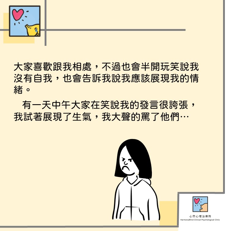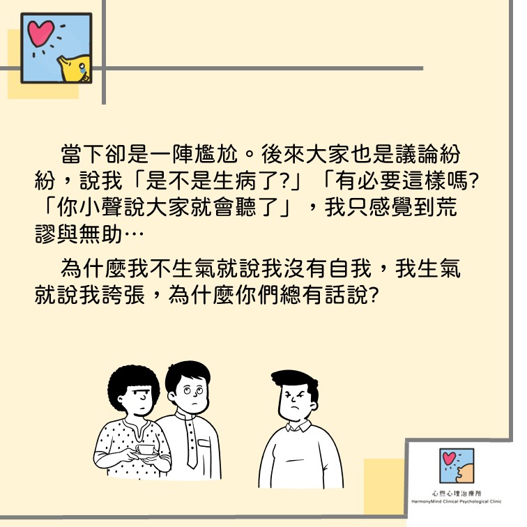 不過其實大家也會半開玩笑說我沒有自我,也會告訴我說我應該展現我的情緒,有一天中午大家在笑說我的發言很誇張,我試著展現了生氣的大聲的罵了他們,但當下一陣尷尬,後來大家也是議論紛紛,說我「是不是生病了?」「有必要這樣嗎?「你小聲說大家就會聽了」,我只感覺到荒謬與無助,為什麼我不生氣就說我沒有自我,我生氣就說我誇張,為什麼你們總有話說?