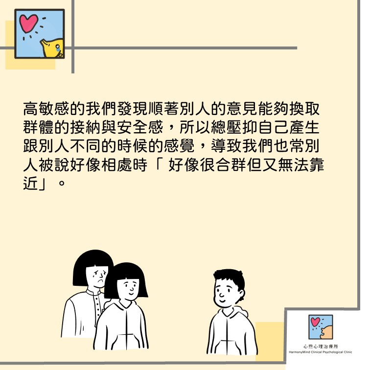 高敏感的我們內心有著強烈的共感力,但也因此承受著不少對「失和」的恐懼,我們發現順著別人的意見能夠換取群體的接納與安全感,所以總壓抑自己產生跟別人不同的時候的感覺,導致我們也常別人被說好像相處時「 #好像很合群但又無法靠近」。