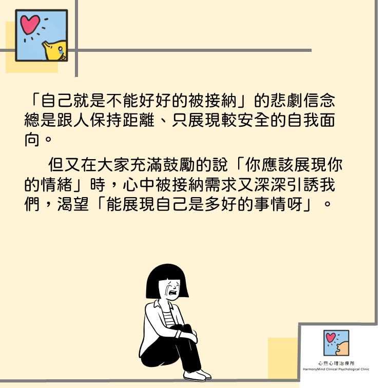 在我們心中,總是感受到衝突侵擾的我們也會凝結出「自己就是不能好好的被接納」的悲劇信念,所以總是跟人保持距離、只展現較安全的自我面向,但又在大家充滿鼓勵的說「你應該展現你的情緒」時,心中被接納需求又深深引誘我們,渴望「能展現自己是多好的事情呀」。