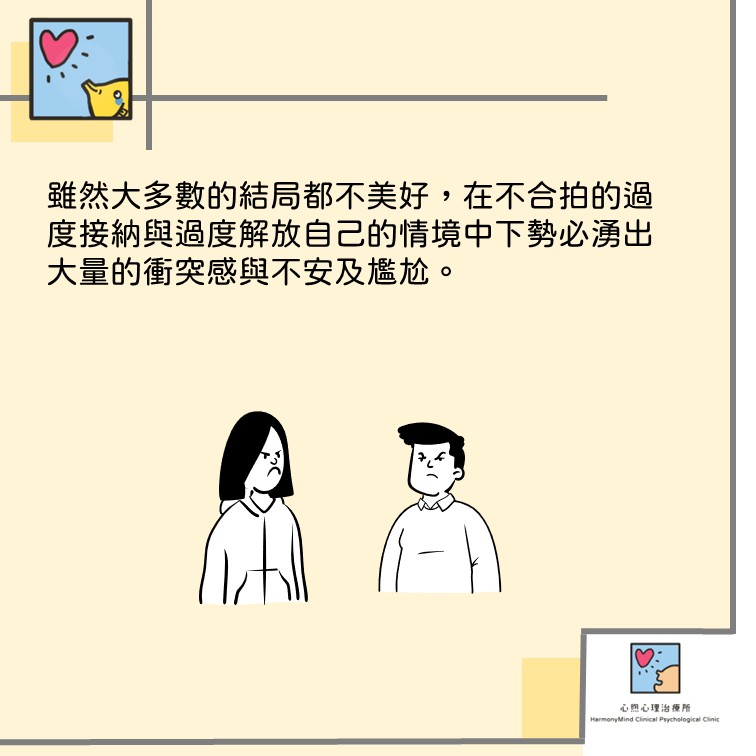 但其實大多數的結局都不美好,在不合拍的過度接納與過度解放自己的情境中下勢必湧出大量的衝突與尷尬,而這種不舒服也好像在指責我們「怎麼又誤信了別人」而讓自己受傷,也開始擔心被別人發現「我其實不是好相處的人」。
