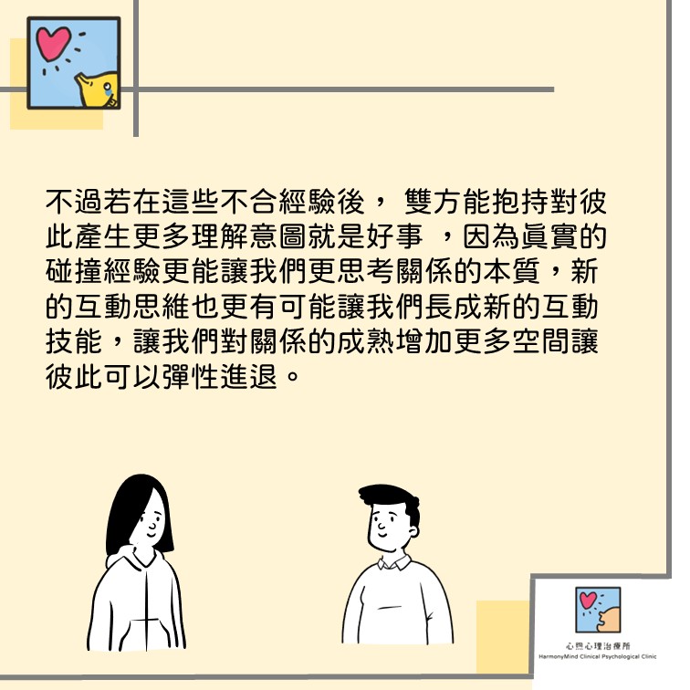 聽起來哀傷,不過若在這些不合經驗後, #雙方抱持對彼此產生更多理解就是好事 ,因為真實的碰撞經驗更能讓我們更思考關係的本質,新的互動思維也更有可能讓我們長成新的互動技能,讓我們對關係的成熟增加更多空間讓彼此可以彈性進退。