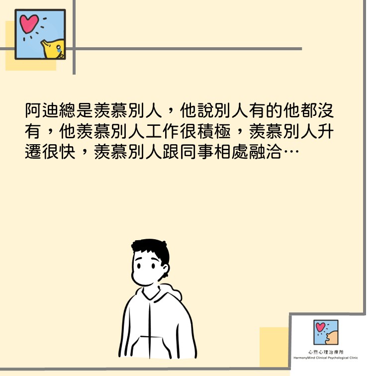 阿迪總是羨慕別人, #他說別人有的他都沒有 。他羨慕別人工作很積極,羨慕別人升遷很快,羨慕別人跟同事相處融洽,羨慕別人準時上下班,羨慕別人有目標,羨慕別人有自己的興趣…。