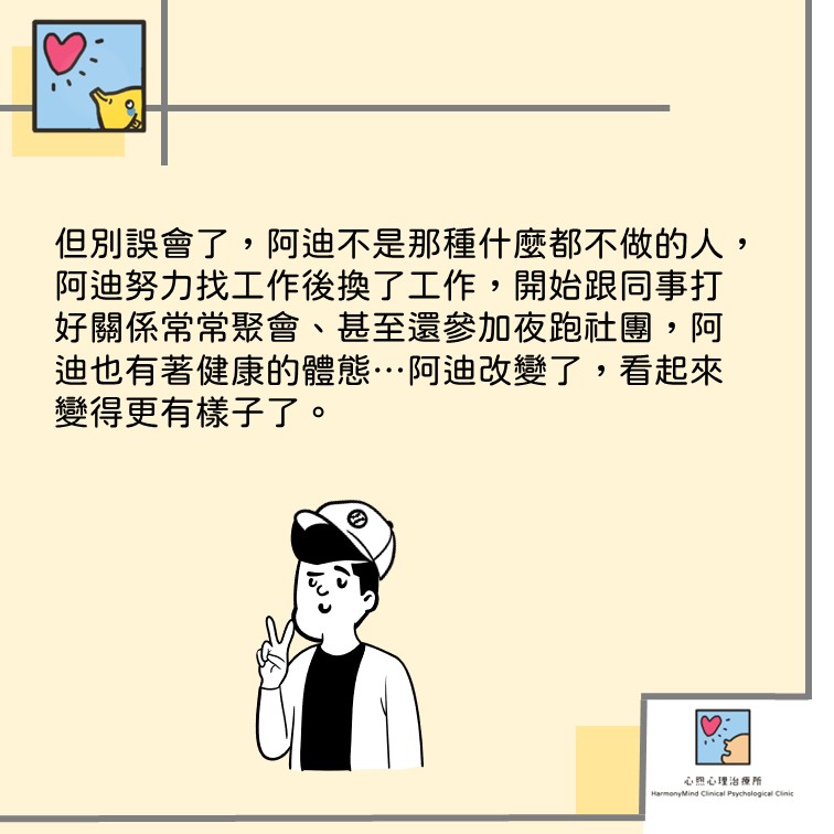 但別誤會了,阿迪不是那種什麼都不做的人,阿迪努力找工作後換了工作,開始跟同事打好關係常常聚會、阿迪學習打扮自己,阿迪安排在平日夜晚學習畫畫和游泳,甚至還參加夜跑社團,…阿迪改變了,看起來變得更有樣子了。