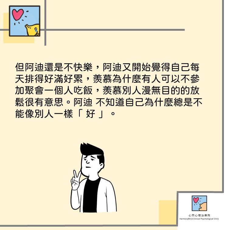但阿迪還是不快樂,阿迪覺得自己每天排得好滿好累,仍在羨慕為什麼有人可以不參加聚會一個人吃飯,羨慕別人漫無目的的放鬆很有意思,羨慕別人可以跟伴侶勇敢吵架,羨慕別人吃街邊小吃也可以很快樂。阿迪 #不知道自己為什麼總是不能像別人一樣「 #好 」 。