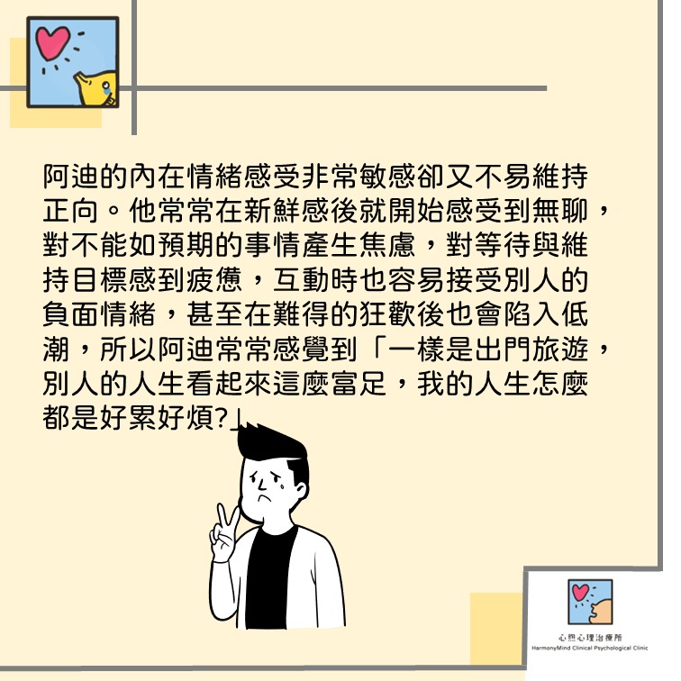 後來發現,阿迪 #內在情緒感受是非常敏感卻又不易維持正向 。他常常在新鮮感後就開始感受到無聊,對不能如預期的事情產生焦慮,對等待與維持目標感到疲憊,互動時也容易接受別人的負面情緒,甚至在難得的狂歡後也會陷入低潮,所以阿迪常常感覺到「一樣是出門旅遊,別人的人生看起來這麼富足,我的人生怎麼都是好累好煩?」