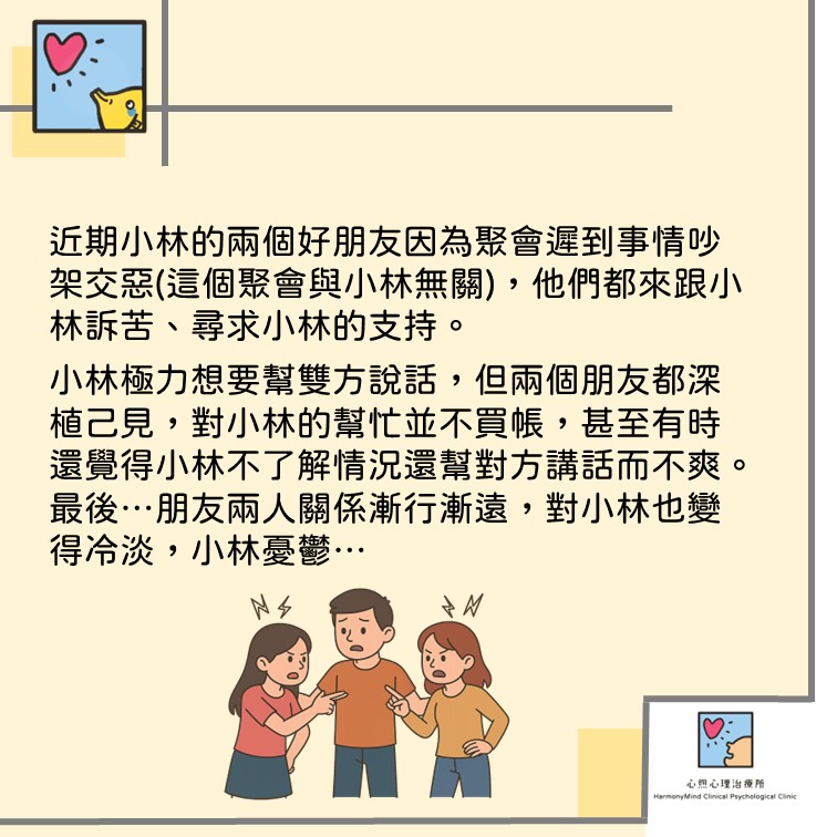 但小林最近遇到一個麻煩:他的兩個好朋友因為聚會遲到事情吵架而交惡(這個聚會與小林無關),他們都來跟小林訴苦、各自說著對方的不是、尋求小林的支持,小林聽後深知雙方彼此有誤會,極力想要幫對方說話,但兩個朋友都深植己見,對小林的幫忙並不買帳,甚至有時還覺得小林不了解情況還幫對方講話而不爽。最後…朋友兩人關係漸行漸遠,對小林也變得冷淡,小林憂鬱。