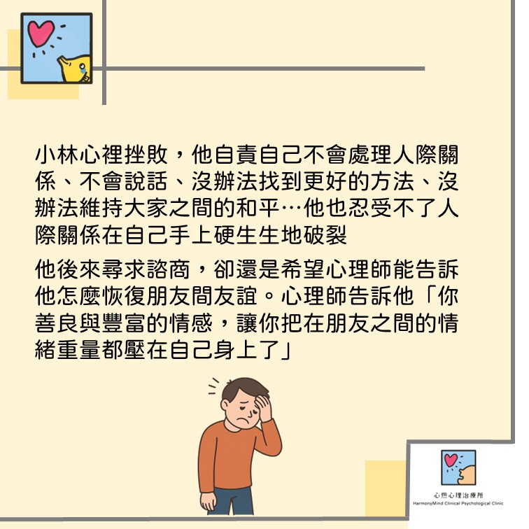 小林心裡挫敗又自責,他討厭自己不會處理人際關係、不會說話、沒辦法找到更好的方法、沒辦法維持大家之間的和平…他也忍受不了人際關係在自己手上硬生生地破裂,他後來尋求諮商,卻還是希望心理師能告訴他怎麼恢復朋友間友誼。心理師告訴他「你善良與豐富的情感,讓你把在朋友之間的情緒重量都壓在自己身上了」