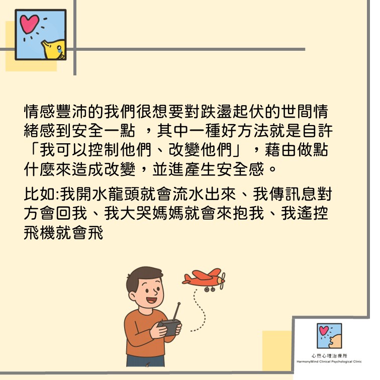 #情感豐沛的我們很想要對跌盪起伏的世間情緒感到安全一點 ,一種好方法就是感到「我可以控制他們、改變他們」,也就是「當我做點什麼,他就會有所改變時」我們就會產生一種 #控制帶來的安全感 。比如我開水龍頭就會流水出來、我傳訊息對方會回我、我大哭媽媽就會來抱我(寶寶很愛)。