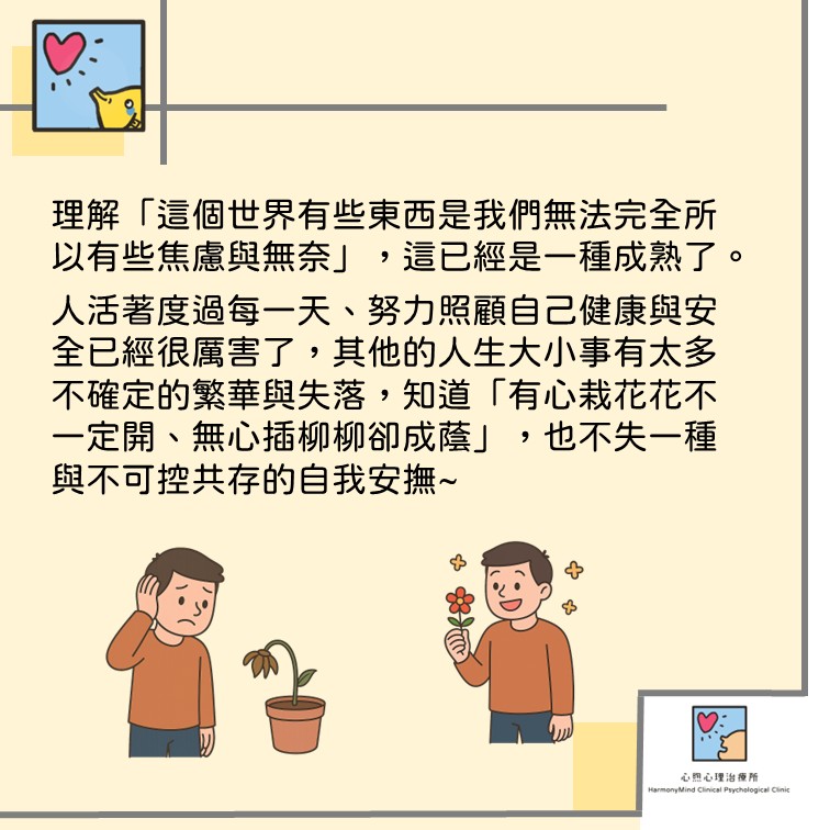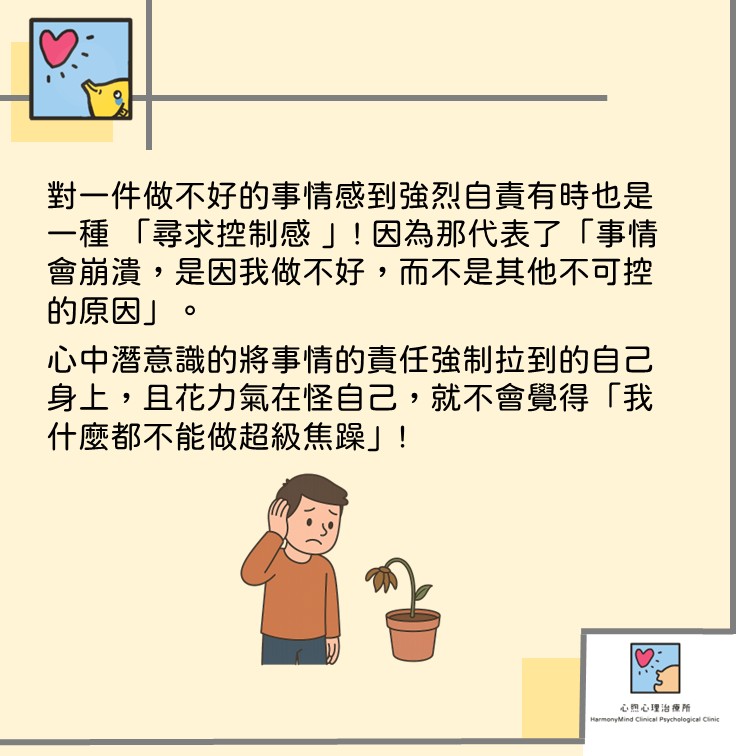 #對一件做不好的事情感到強烈自責有時也是一種 「#尋求控制感 」! 因為那代表了「事情會崩潰,是因我做不好,而不是其他不可控的原因」,我們潛意識將責任強制拉到的自己身上,且花力氣怪自己,心裡就不用感到「我什麼不能做」而焦躁到爆炸。就像小林的朋友們爭執時的情緒互轟、他們心裡對彼此的成見、以往的互動經驗甚至是價值觀,其實都不是小林該負的責任,但小林心中卻深深認為是自己的問題所以朋友才會決裂。 理解「這個世界有些東西是我們無法完全所以有些焦慮與無奈」,就已經是一種成熟了,真的,人活著是件不容易的事情,努力照顧自己健康與安全已經很厲害了,其他的人生大小事有太多不確定的繁華與失落,知道「有心栽花花不一定開、無心插柳柳卻成蔭」,也不失一種與不可控共存的自我安撫~
