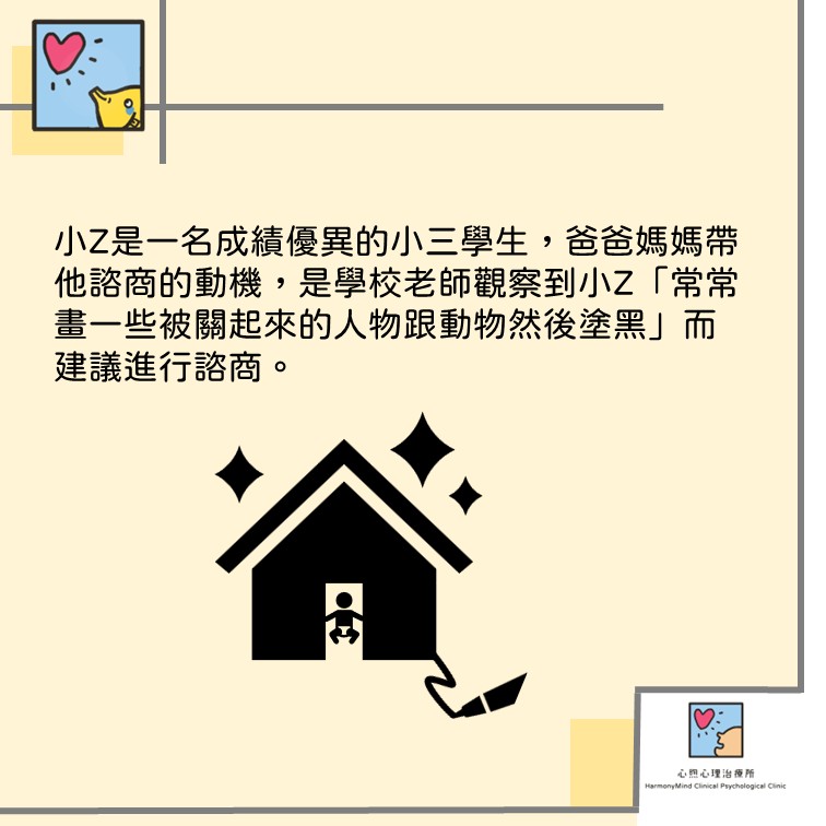 小Z是一名成績優異的小三學生,爸爸媽媽帶他諮商的動機,是學校老師觀察到小Z「常常畫一些被關起來的人物跟動物然後塗黑」而建議進行諮商,但此外爸媽說小Z在學校其實沒有什麼異常狀況。