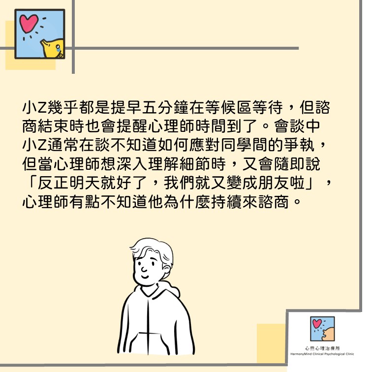 後續一個月的諮商中,小Z都非常準時到,通常幾乎是提早五分鐘在等候區等待,但諮商結束時也會提醒心理師時間到了。會談中小Z通常在談不知道如何應對同學間的爭執,但當心理師想深入理解細節時,又會隨即說「反正明天就好了,我們就又變成朋友啦」,心理師有點不知道他為什麼持續來諮商。
