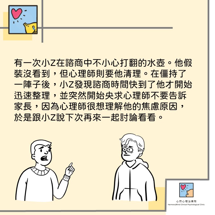 幾次諮商後後小Z與心理師越來越熟,小Z變得調皮,開始會跟心理師玩各種丟擲遊戲並打鬧…直到有一次小Z在諮商中不小心打翻的水壺。他假裝沒看到,但心理師則要他清理。在僵持了一陣以後,小Z發現諮商時間快到了他才開始迅速整理,並突然開始央求心理師不要告訴家長,因為心理師很想理解他的焦慮原因,於是跟小Z說下次再來一起討論看看。
