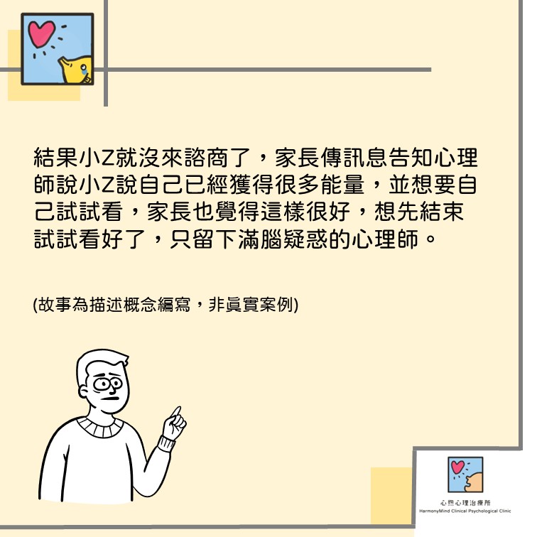 結果小Z就沒來諮商了,家長傳訊息告知心理師說小Z說自己已經獲得很多能量,並想要自己試試看,家長也覺得這樣很好,想先結束試試看好了,只留下滿腦疑惑的心理師。(故事為描述概念編寫,非真實案例)