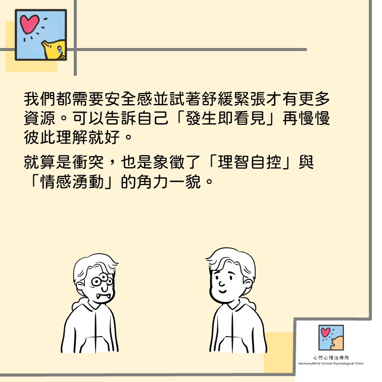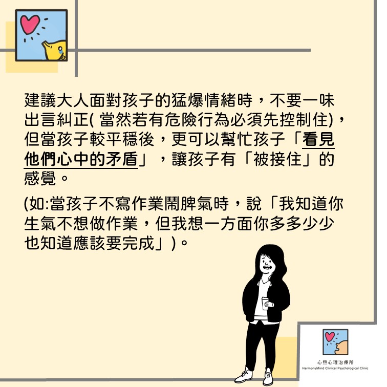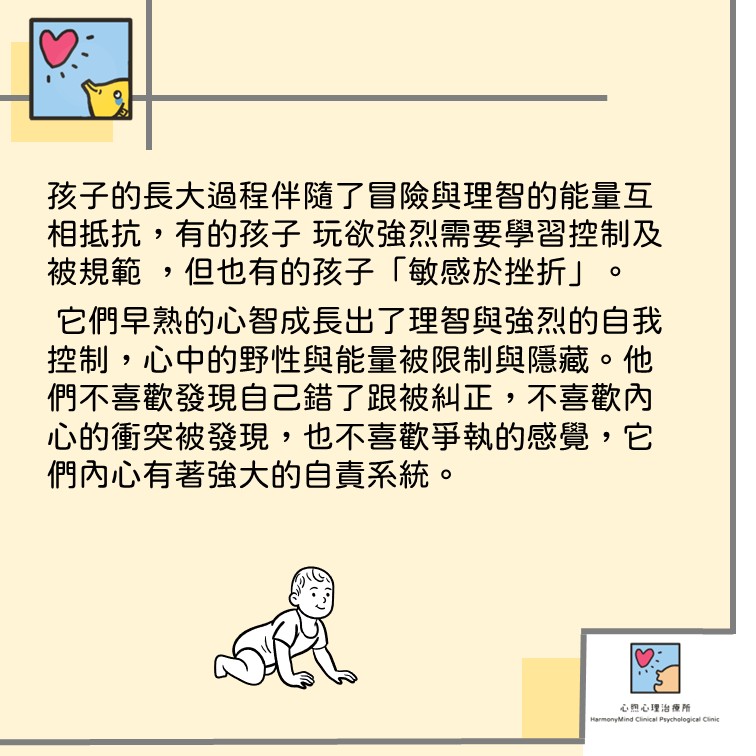 孩子的長大過程伴隨了冒險與理智的能量互相抵抗,有的孩子 #玩欲強烈需要學習控制及被規範 ,但也有的孩子 #敏感於挫折 , #早熟的成長出了理智與強烈的自我控制,心中的野性與能量被限制與隱藏。這樣的孩子不喜歡發現自己錯了跟被糾正,不喜歡內心的衝突被發現,也不喜歡爭執的感覺,因為這些事情都會觸發強大的自責系統:他們內心湧起的羞愧遠比一般孩子更劇烈,心中常混雜恐懼與憤怒,短時間內心理混亂而無方向繁亂,也不知道要朝自己或糾正他的人,失控的感覺會讓自己更想逃走,更想壓抑跟忽略。 先深呼吸讓自己舒緩一下吧,告訴自己「發生即看見」就好。因為就算是衝突,也只是象徵了「理智自控」與「情感湧動」角力的傾斜,它們看似互相制衡其實也是彼此協力調節來幫我們過好人生。建議大人面對孩子的猛爆情緒時,不要一味出言糾正(當然若有危險行為必須先控制住),當孩子較平穩後,可以幫忙孩子「看見」他們心中的矛盾,讓孩子有「被接住」的感覺。